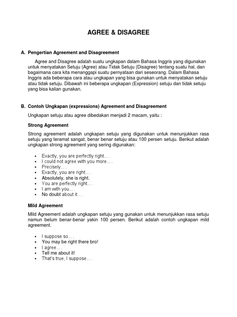 Materi agreement and disagreement. Di dalam bahasa inggris disagree mempunyai arti yaitu tidak setuju sama seperti halnya dengan agree disagree pun terbagi dalam 2 tipe yaitu strong disagreement dan mild disagreement. Materi agreement dan disagreement ini biasanya dipelajari di kelas 9 smp yang biasanya kita kenal dengan expression of agreement and disagreement. Agreement itu sendiri sederhananya dapat kita artikan dengan setuju kesetujuan persetujuan namun pengertian dari kata persetujuan itu dapat bermakna luas sesuai dengan konteks yang dibahas.